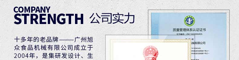 廣州旭眾食品機(jī)械有限公司是一家集科研開發(fā),生產(chǎn)設(shè)計(jì),營銷服務(wù)為一體的現(xiàn)代化生產(chǎn)企業(yè)?,F(xiàn)代化生產(chǎn)車間,精湛制造技術(shù),所產(chǎn)機(jī)械歷經(jīng)市場重重考驗(yàn),不斷贏得海內(nèi)外客戶的贊譽(yù)。