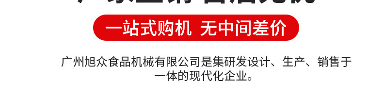 廣州旭眾食品機(jī)械有限公司是一家集科研開發(fā),生產(chǎn)設(shè)計(jì),營銷服務(wù)為一體的現(xiàn)代化生產(chǎn)企業(yè)?,F(xiàn)代化生產(chǎn)車間,精湛制造技術(shù),所產(chǎn)機(jī)械歷經(jīng)市場(chǎng)重重考驗(yàn),不斷贏得海內(nèi)外客戶的贊譽(yù)。