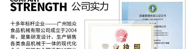 廣州旭眾食品機(jī)械有限公司是一家集科研開發(fā),生產(chǎn)設(shè)計(jì),營銷服務(wù)為一體的現(xiàn)代化生產(chǎn)企業(yè)?,F(xiàn)代化生產(chǎn)車間,精湛制造技術(shù),所產(chǎn)機(jī)械歷經(jīng)市場重重考驗(yàn),不斷贏得海內(nèi)外客戶的贊譽(yù)。
