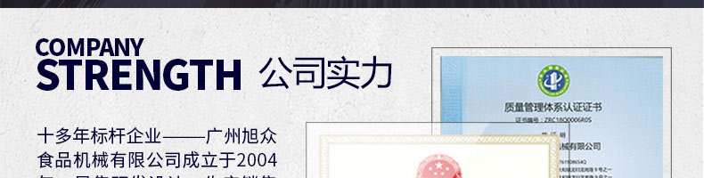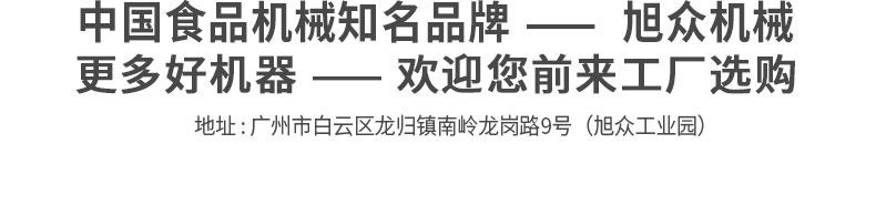 廣州旭眾食品機械有限公司是一家集科研開發(fā),生產設計,營銷服務為一體的現(xiàn)代化生產企業(yè)?,F(xiàn)代化生產車間,精湛制造技術,所產機械歷經(jīng)市場重重考驗,不斷贏得海內外客戶的贊譽。