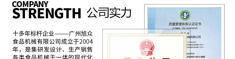 廣州旭眾食品機(jī)械有限公司是一家集科研開發(fā),生產(chǎn)設(shè)計(jì),營銷服務(wù)為一體的現(xiàn)代化生產(chǎn)企業(yè)?,F(xiàn)代化生產(chǎn)車間,精湛制造技術(shù),所產(chǎn)機(jī)械歷經(jīng)市場重重考驗(yàn),不斷贏得海內(nèi)外客戶的贊譽(yù)。