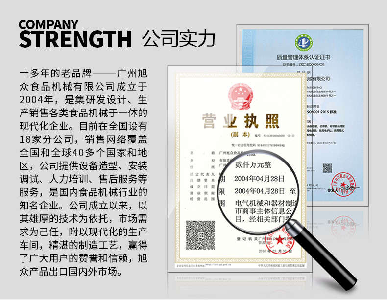 廣州旭眾食品機(jī)械有限公司是一家集科研開(kāi)發(fā),生產(chǎn)設(shè)計(jì),營(yíng)銷服務(wù)為一體的現(xiàn)代化生產(chǎn)企業(yè)。現(xiàn)代化生產(chǎn)車間,精湛制造技術(shù),所產(chǎn)機(jī)械歷經(jīng)市場(chǎng)重重考驗(yàn),不斷贏得海內(nèi)外客戶的贊譽(yù)。